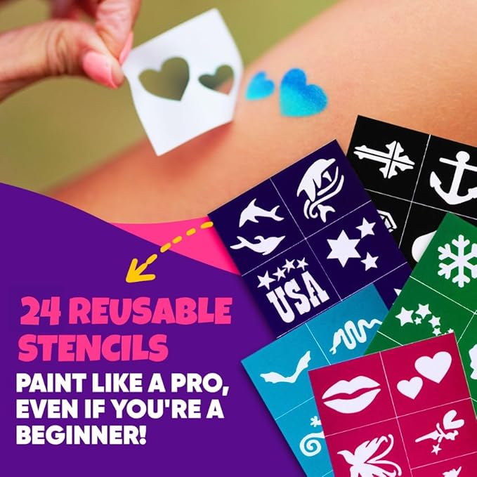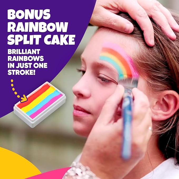 - π¨ ππ’π π£πππ§π ππππ π£πππ‘π§ πππ§: Unleash creativity with 28 vibrant color face painting kit for kids, 24 reusable stencils, 100 gem stickers, 2 body glitter pots, 3 brushes, 4 sponges, & a 16-design booklet & bonus rainbow split cake - fun for the whole family! A fun Halloween face paint kit with stencils and Halloween face paint kit for adults. Please note: Packaging may vary