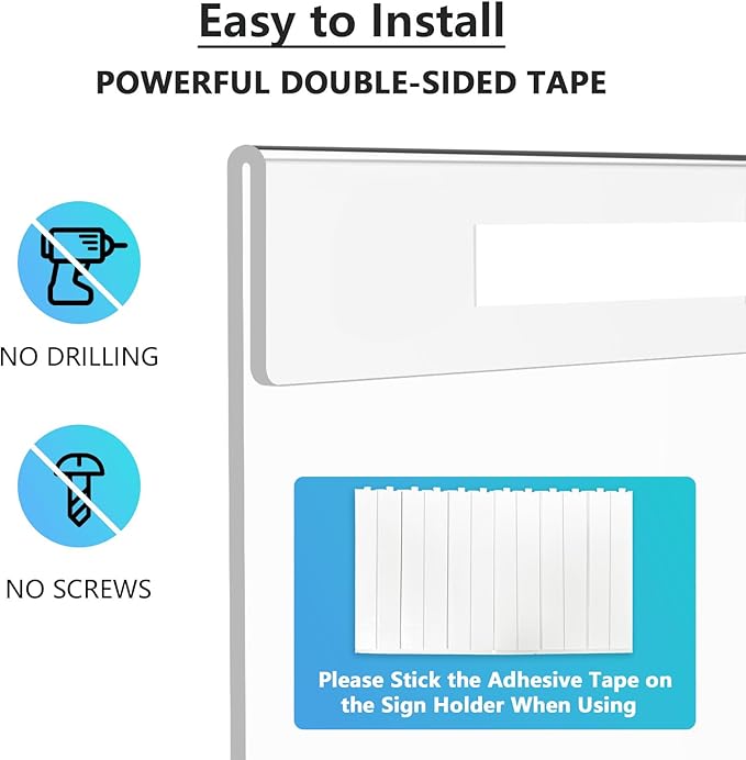 - Easy to install: MaxGear acrylic sign holder uses double-sided tape for quick and effortless mounting on any flat surface - no screws, drills, or tools needed. Works on drywall, metal, plastic, wood, glass, and more.