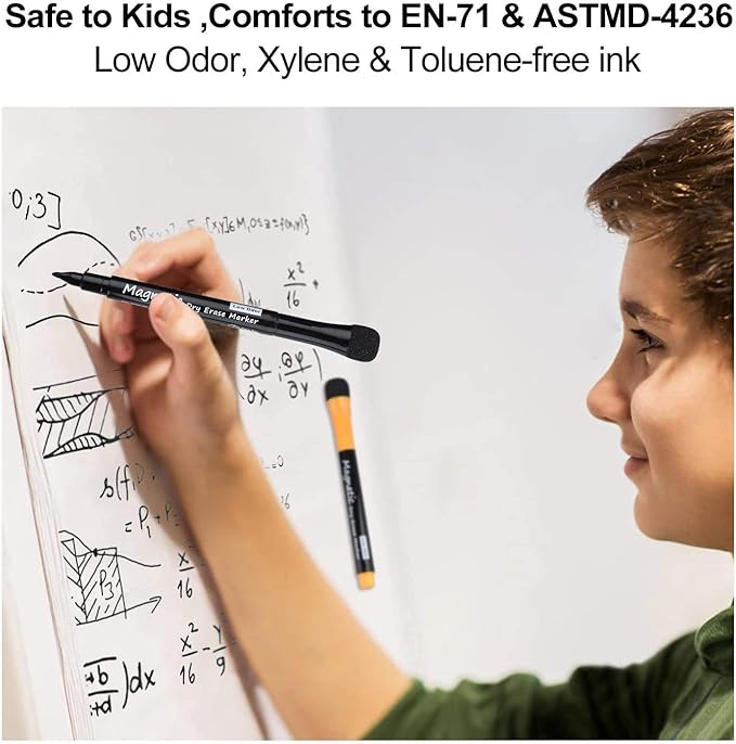 - [ Convenient Design: Magnetic marker caps feature built-in felt erasers] - The magnet allows the marker to be right on the fridge and never get lost. with the erase, there is no need for a separate eraser for erasing small mistakes