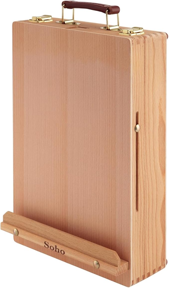 - Carrying Case: The SoHo Sketch Box and Table Easel is a Carrying Case with 5 sections for organizing a full assortment of gear. Made Of deluxe finished hardWood, it is complete with a handle and rubber feet to Protect table tops. It is 10.5" x 15.25" and has an easel section built into the lid that can be adjusted for a Variety of Painting Applications. Use any Size Canvas or panel up to 25.5" high.
