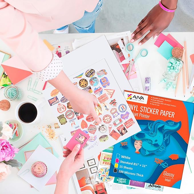 - High-Quality Printable Vinyl Paper - set includes 15 white vinyl sheets of Printable Sticker Paper for printer, Glossy finish. US Standard Letter Size - 8.5"x11". Suitable for High resolution and clear image quality