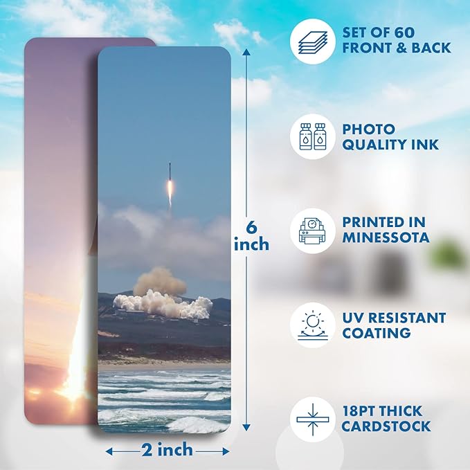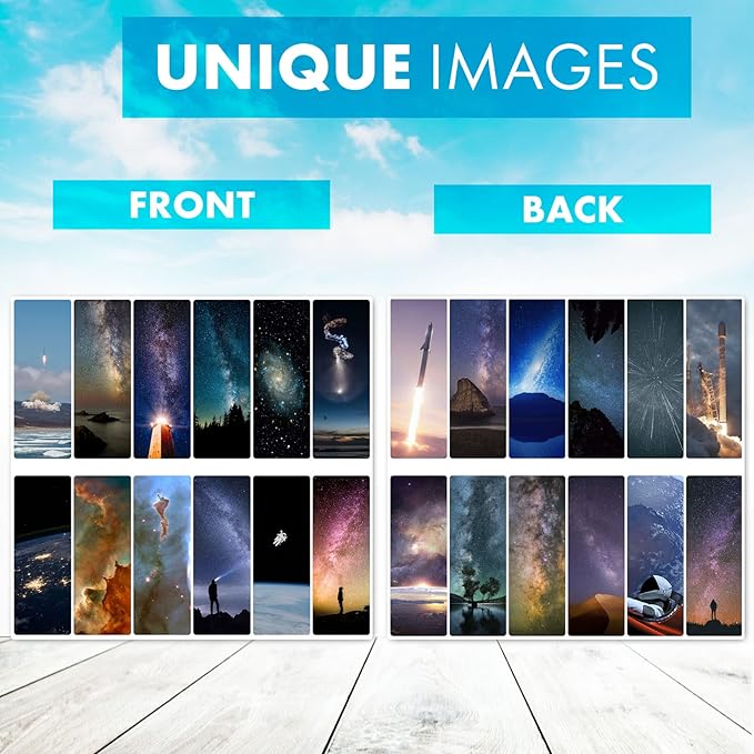 - ∞ BUILT TO LAST ∞ This 12 pack of 7" x 2" cool space bookmarks are made with the heavy 120# coated matte stationary card with a soft-touch water proof coating.