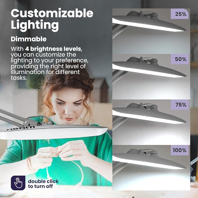 - Versatile & User-Friendly – This office desk lamp allows you to adapt the lighting to your needs with four brightness levels (100%, 75%, 50%, or 25%). The flexible clamp design ensures optimal lighting angles, making it perfect as a desktop lamp or workbench light to enhance productivity and comfort during various activities.