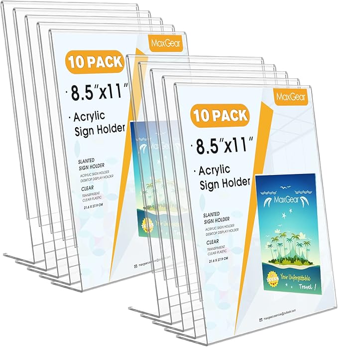 MaxGear Sign Holder 8.5x11 inches, Acrylic Sign Holder Slant Back Sign Holder Clear Sign Holder Plastic Paper Holder Table Top Sign Holder Plastic Display Stand for Office, Store, 10 Pack