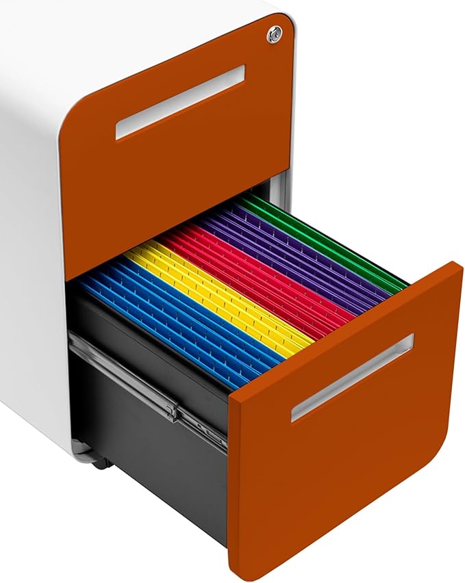 Laura Davidson Furniture Stockpile 2 Drawer Mobile File Cabinet with Lock - Under Desk Metal Filing Cabinet, Legal/Letter File Folders, Wheels and Stationary Feet, Pre-Assembled, White/Orange