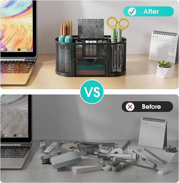 - Large Capacity: The dimension of pencil holder is 8.75 x 4.5 x 4 inch, includ 9 compartments with 1 drawer, suitable for storing pens, pencils, markers, erasers, rulers, scissors, paper clips, thumbtacks, rubber bands, tapes, sticky notes, cards, and other small accessories, fulfill your daily desktop organization requirements