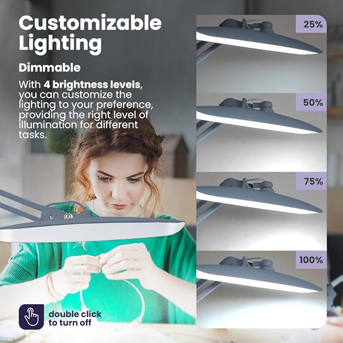 - Versatile & User-Friendly – This office desk lamp allows you to adapt the lighting to your needs with four brightness levels (100%, 75%, 50%, or 25%). The flexible clamp design ensures optimal lighting angles, making it perfect as a desktop lamp or workbench light to enhance productivity and comfort during various activities.