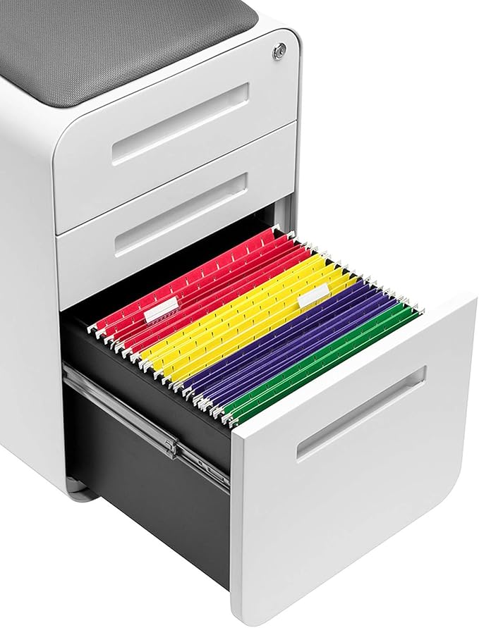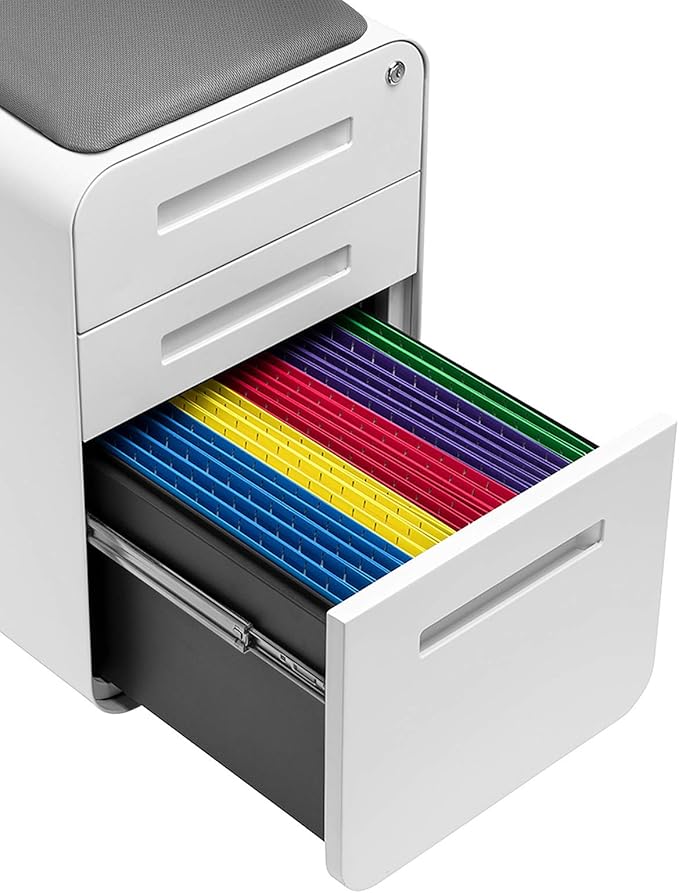 Laura Davidson Furniture STOCKPILE Curve Seated 3-Drawer Mobile File Cabinet with Removable Magnetic Cushion Seat - Metal Filing Cabinet, Pre-Assembled, White with Dark Grey Cushion