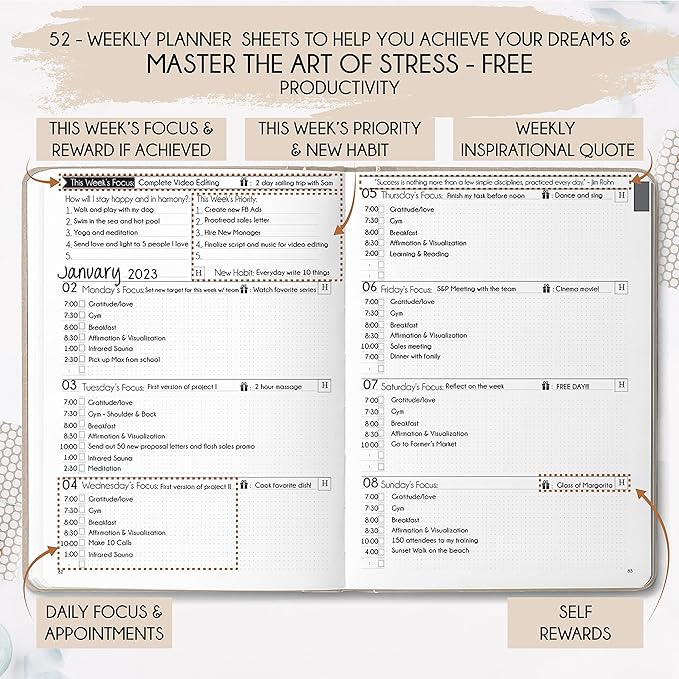 - REDUCE OVERWHELM, STRESS AND FIX PROCRASTINATION - Follow a unique 8 step system that will help you bring back harmony, clarity, and peace in your life while achieving your goals. This planner is perfect birthday gifts for men and women, anniversary gift for couple and lastly gifts for friends
