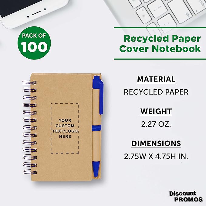Custom Mini Spiral Notebooks with Black Ink Pens Set of 100, Personalized Bulk Pack - Perfect for School, Office, Business, Home - Blue