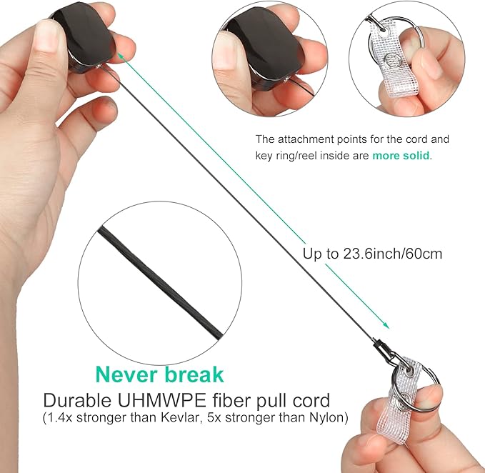 - Unbreakable Cord. Forget annoying cord breaks, the 23.6" UHMWPE fiber cord makes our retractable badge reel more flexible and stronger than steel wire. Unlocking doors has never been this easy.
