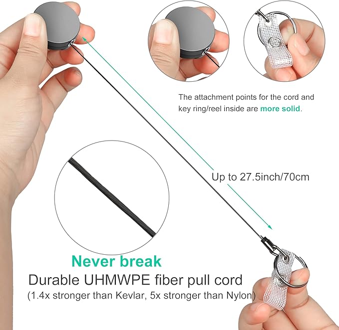 - Unbreakable Cord. Forget annoying cord breaks, the 27.5" UHMWPE fiber cord makes our retractable badge reel more flexible and stronger than steel wire. Unlocking doors has never been this easy.