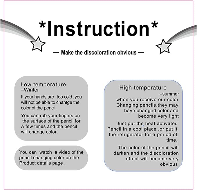- Change Color: change color at about 40-50 degrees; You can first put the pencil in the refrigerator for a period of time, the pencil will turn black, and then hold the thermochromic pencil tightly in your hand, as the temperature of the hand is transferred to the pen, the pen holder will turn bright colors