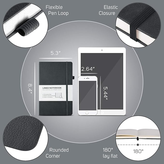 - Handy All-in-one Journal: Medium notebook, 5.3" x 8.4", suitable in bag and handy in hand; 1 Solid expandable back pocket and 1 front pocket for loose leaf paper, bills, receipts; 1 Elastic pen loop for various szies’ pens; 1 Elastic band to keep notebook closed.