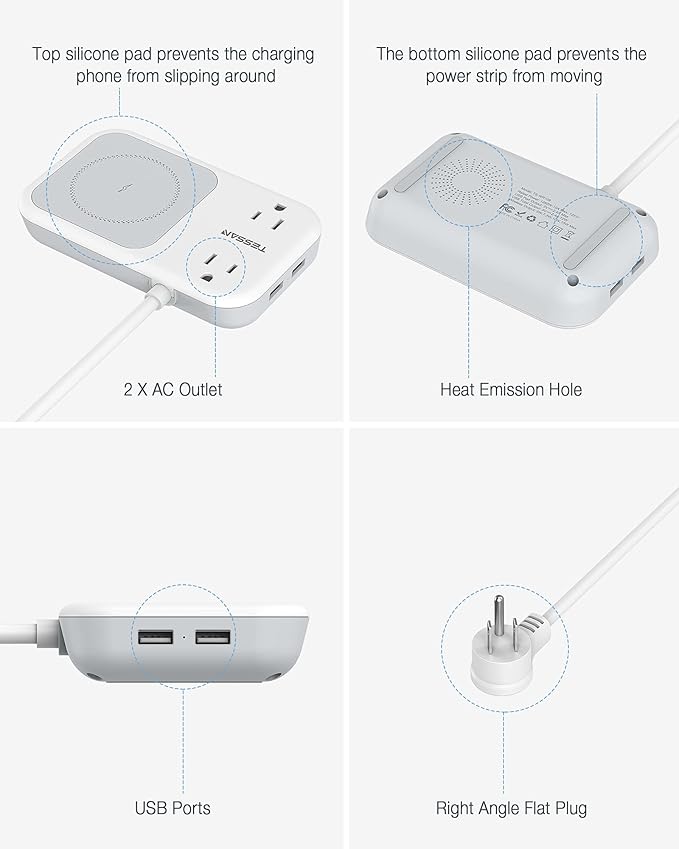 Wireless Charger Small Power Strip 2 USB A Ports, TESSAN Mini Flat Plug Nightstand Desktop Charging Station with 2 Outlet 4 ft Extension Cord, Compatible with iPhone and Samsung for Dorm Room Cruise