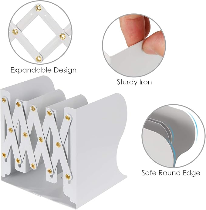 Olebes Adjustable Book Ends, Metal Iron Non Skid Boo kends, Expandable Bookcase Bookend Stand Holder Book Storage Rack, Heavy Bookends for Office Desk, Shelf, Stationery (White)