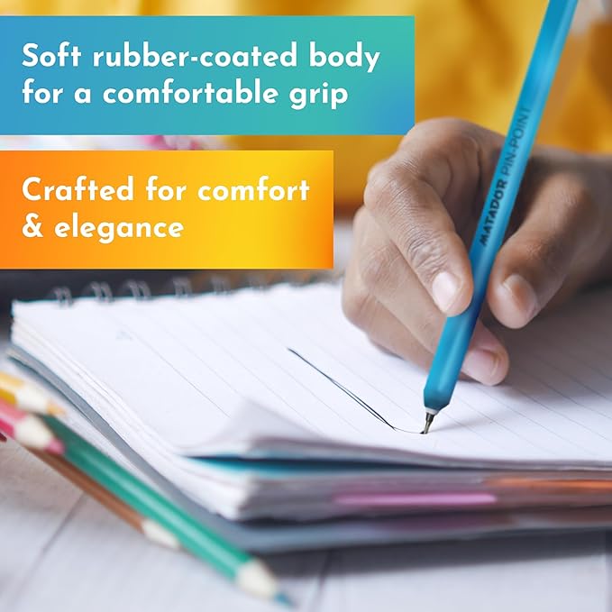Matador Pin-Point Ball Pen | Oil Based Gel Ink | Soft Rubber Coated Body | 5 Attractive Body Colour | Retractable Fine (0.6mm) NS Tips with TC Ball | Pack of 12 (Blue)