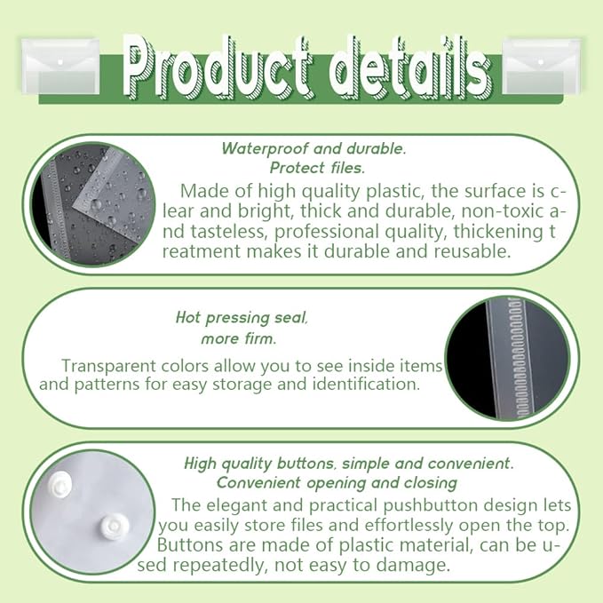- Thoughtful: different from other unstable closures, our reusable envelopes are all with snap closure, which can protect your items more effectively