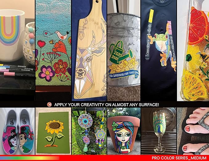 - ✔️MULTI SURFACE –The highly pigmented ink gives you nice opaque coverage on most surfaces such as stone, glass, wood, metal, fabric, porcelain, canvas, plastic, paper, cardboard, pottery, shoes, shirts, etc. The fade-resistant paint works great on dark and light surfaces. It dries quickly to prevent smudging.