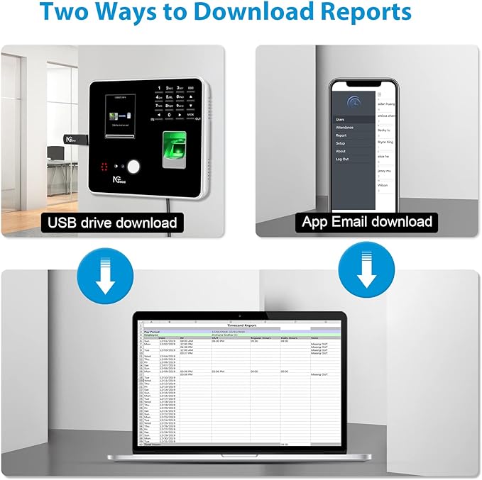 - No Monthly Fees: The time clock operates right out of the box with no monthly subscription costs. You can effortlessly send time reports to your email using the free NGTeco Time App.