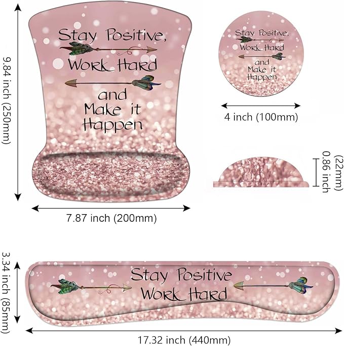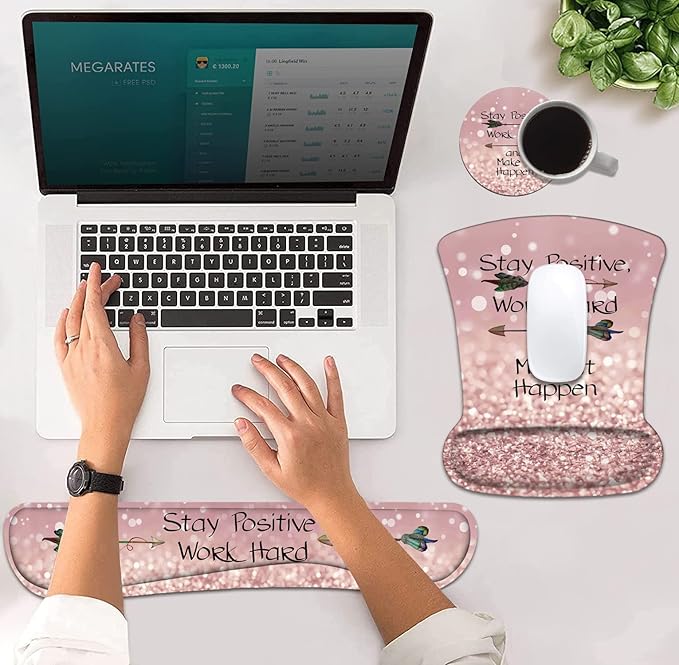 Mouse Pad Wrist Support and Keyboard Wrist Rest Set with Coasters, Inspirational Quote Stay Positive Work Hard and Make It Happen Wrist Mouse Pad with Non-Slip PU Base for Home Office Working Studying