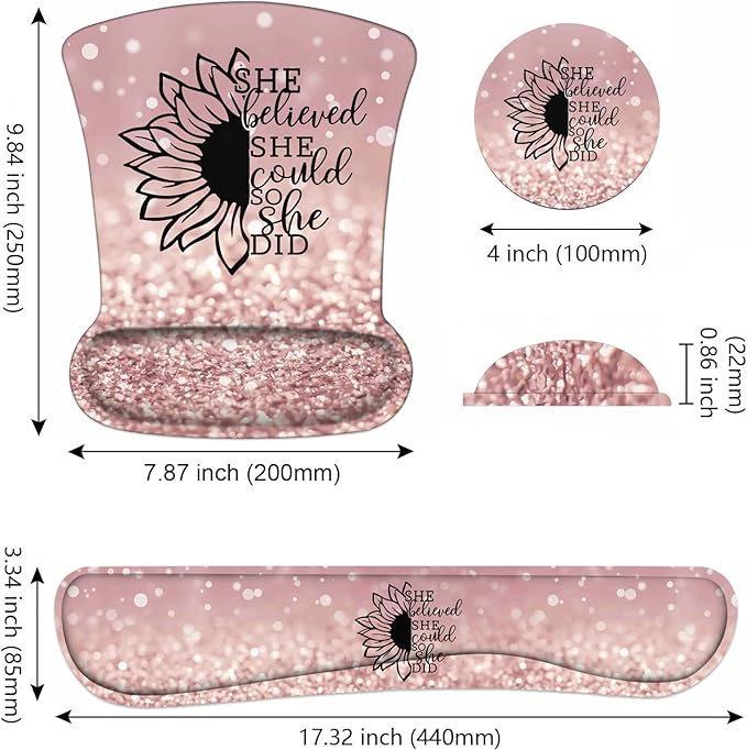 Mouse Pad Wrist Support and Keyboard Wrist Rest Set with Coasters, She Believed She Could So She Did Inspirational Quote Wrist Mouse Pad with Non-Slip PU Base for Home Office Working Studying