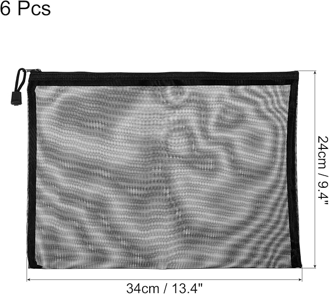 MECCANIXITY Mesh Zipper Bags, A4 Nylon Zip Pouch Pencil Case Storage Pockets for Travel Office Accessories, Black Pack of 6