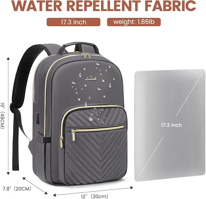 - đŻăUpgraded Laptop Backpack Womenă: Classic V-shaped embroidery thread. Upgraded double LOVEVOOK no-slip metal zippers,water resistant Nylon fabric with polyester lining, ensures long lasting usage. Total of 4 compartments and 16 pockets for your computer,A4 folder,bottles,umbrellas,clothes,work supplies,college supplies and travel essentials.Dimensions: 12"L 19"H 7.8"D, Weight: 1.86lbs.