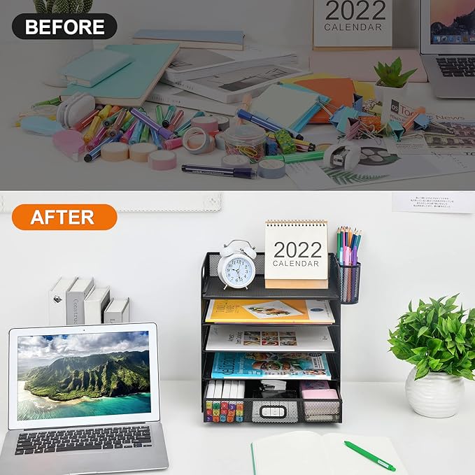 - 【Multifunction Organization】The paper tray organizer is very suitable for storing books, magazines, letters, and A4 paper. The drawer organizer and hanging pen holder enough accommodate all office supply accessories, such as pens, pencils, scissors, and so on. Perfect Size: 13.4*12.6*9.1inch.