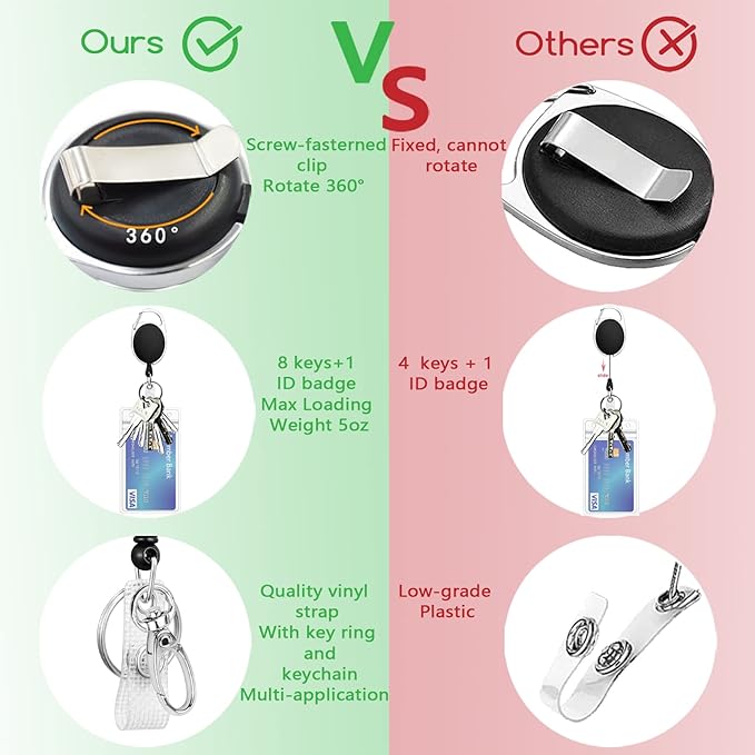 - 360 Degrees Swivel: The retractable badge reel is made of premium plastic and steel, sturdy and light-weight. It is easy to clip on to a belt, backpack, pocket or anywhere you like, with 360 rotating carabiner clip. You can attach your keys, student cards, or ID cards to the key holder easily and conveniently. Great for nurses, doctors, maintenance, office staff, business people, teachers, students, factory workers, drivers, etc