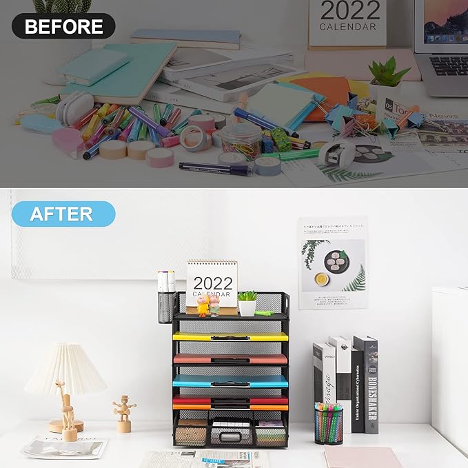 Lavatino 6-Tier Paper Organizer Letter Tray with Drawer - Mesh Desk File Paper office Supplies Sorter Organizer for Office, Home or School File Folder Holder - Black