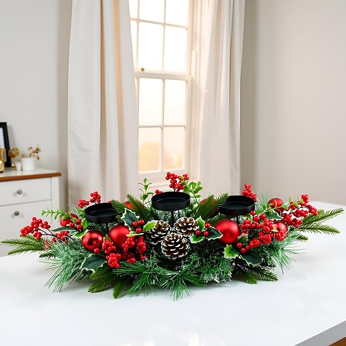 - Exquisite Design ♥ Embracing a metal body intricately wrapped in natural rattan, our holiday candle holder is adorned with a festive blend of red baubles, pine cones, red berries, green leaves holly, spruce branches and pine needles, setting a perfect Christmas theme.