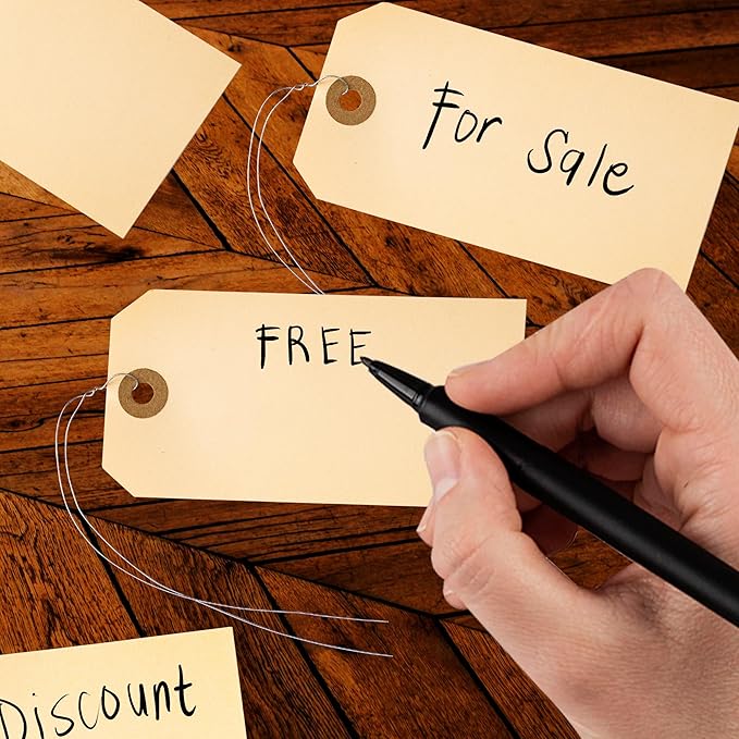 - REINFORCED FIBER PATCH: These merchandise tags with string are made of fiber patch reinforced durable 1/4 Inch Hole with pull-strength shipping tags and tear-resistant pre-wired marking tags that ensure it stays put when tied into items.