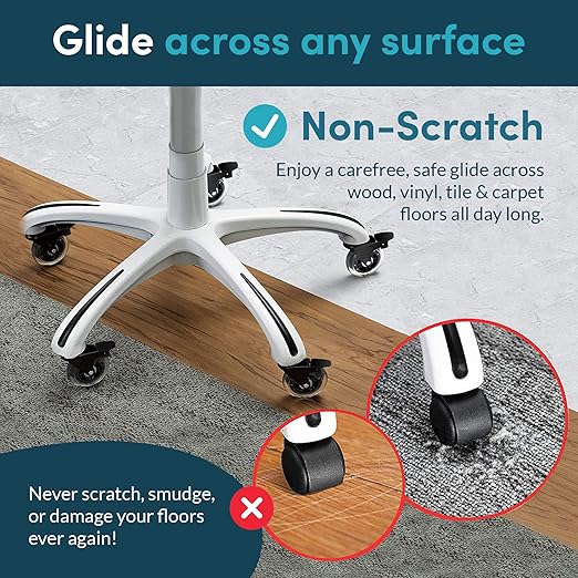 - DESK CHAIR MAT WILL NOT BE NEEDED ANYMORE – Our desk chair wheels replacement will NEVER scratch, smudge or damage your floors. Enjoy a carefree, safe glide across wood, hardwood, laminate, vinyl, tile and carpet floors all day long. P.S. Regarding the smooth rolling on carpet it depends on the pile carpet that you have, some roll better and some aren’t as smooth. High pile carpet usually rolls less smooth than low pile.