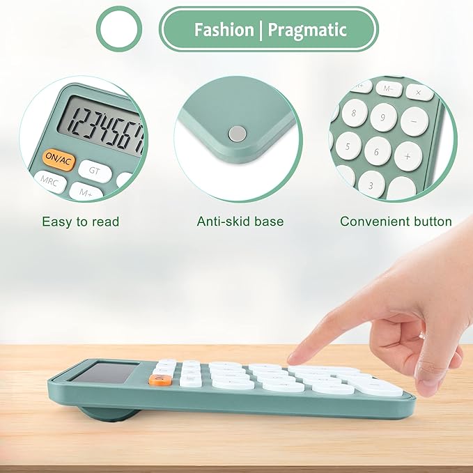 - BIG DISPLAY: Large button, candy color. Large LCD screen, 12-digit display, vertical back, 15-degree angle for easy-to-read calculator. One LR44 battery is included in the package