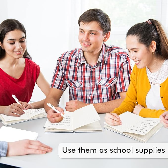 - Feela 12 Pack Classic Ruled Notebooks contains 12 white ruled sturdy cover notebooks and 12 Black Retractable Pens. Each of the notebooks measures 8.3” x 5.1”, which is perfect to carry and easily held by young girls and boys. These black cute pens are customized to be placed in the pen holder, which is pretty convenient.
