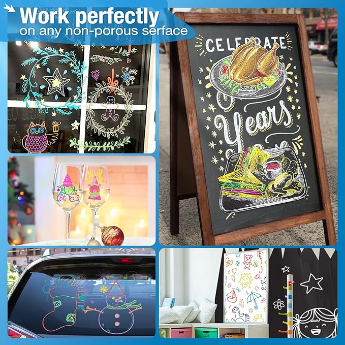- 【Widely Use】Works perfectly on any non-porous surfaces with this set of glitter liquid chalk markers, you can use these liquid chalk board markers, colored chalkboard markers as auto window markers, glass markers on car decoration, mirrors, whiteboard, chalkboard, bistro, Christmas banner, poster and any DIY arts & craft supplies