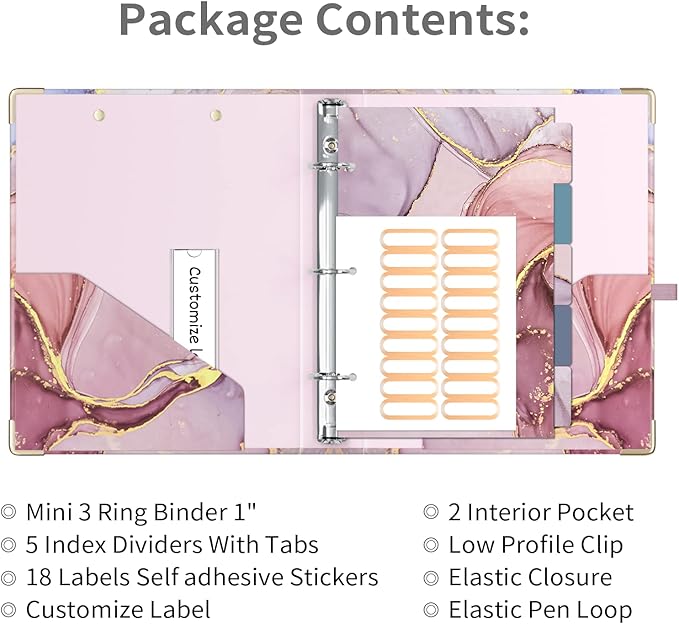 Ospelelf Mini 3 Ring Binder 1 Inch, Cute Pink Marble for 5.5" x 8.5" With 5 Tab Dividers, File Folder Labels and Low Profile Clipboards for School and Office Supplies