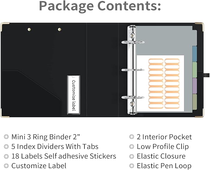 - 【Small Binder with Dividers】Mini Binder comes with 5 index dividers with tabs and 18 custom label stickers for easy viewing. Features two interior pocket to store letter size papers and important loose documents.