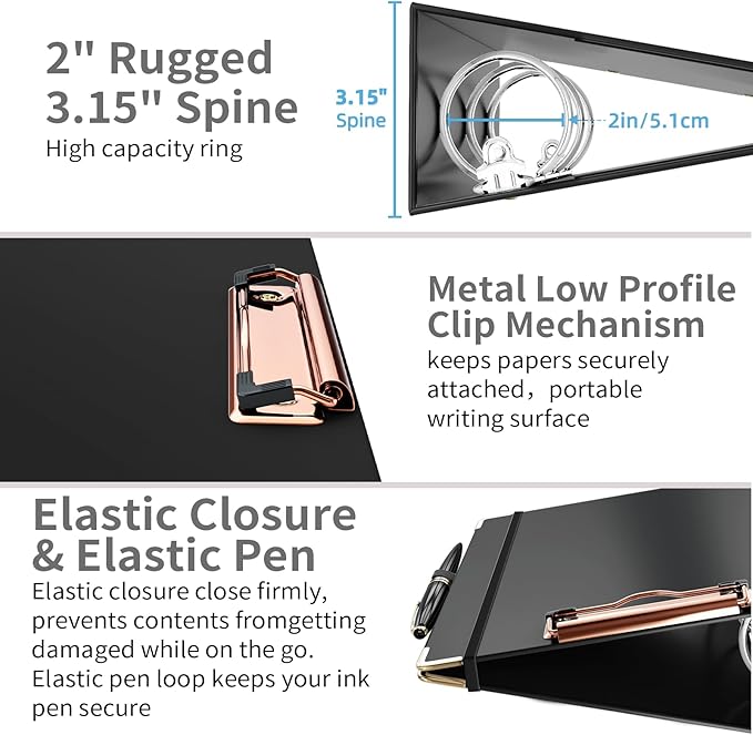 - 【Clipboard & Elastic Closure Design】Booklet-size clipboard with durable cardboard base provides a hard, portable writing surface;Low-profile clip can hold up to 100 sheets paper. In addition, the binder's elastic closure not only can close the binder firmly, but also acts as a bookmark.
