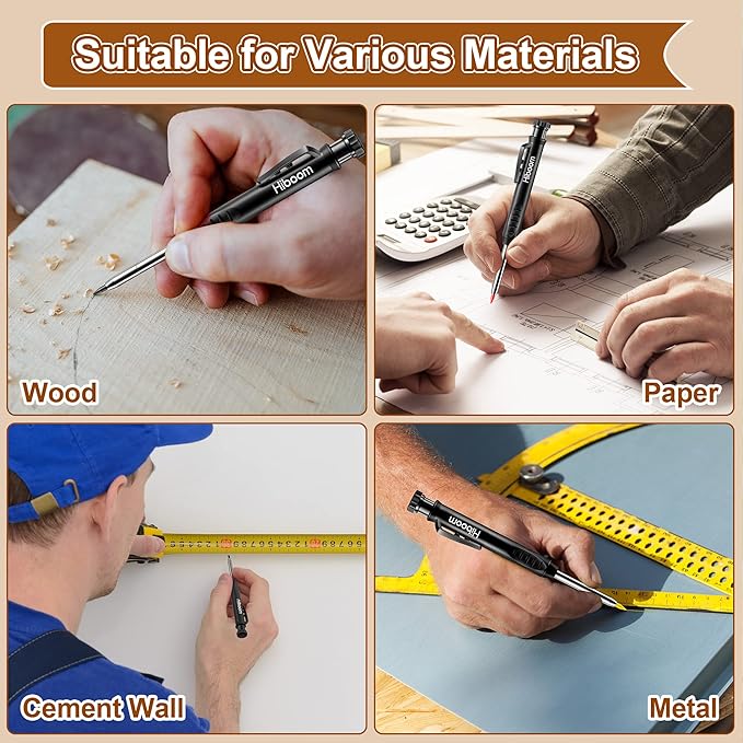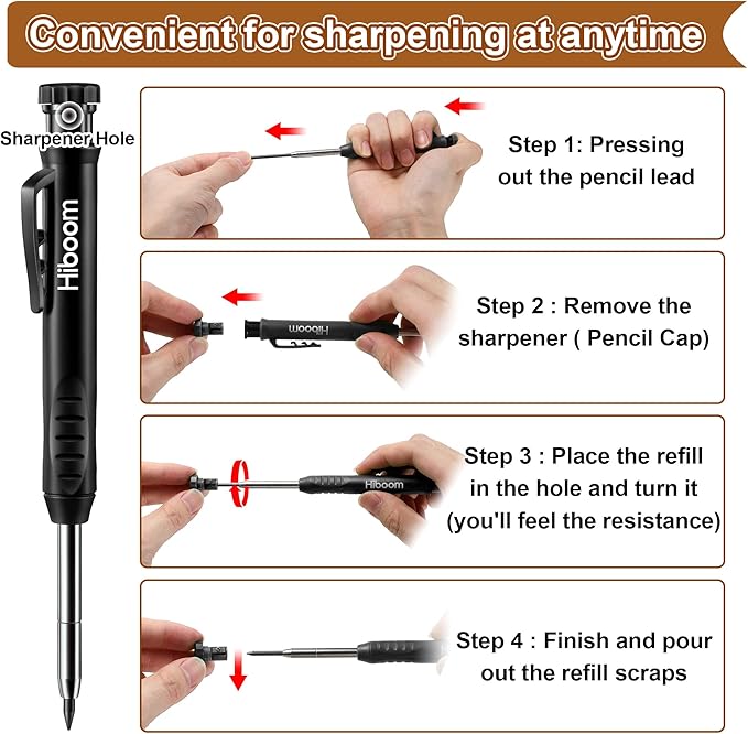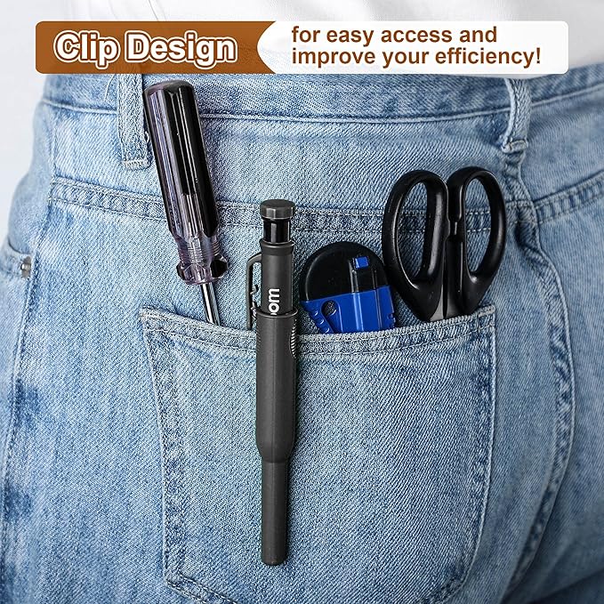 - Easy to Use: Hiboom's woodworking pencil features an ergonomic grip designed for comfort, reducing fatigue even during extended use. The clip design allows for easy access and can be attached to a pocket for improved efficiency. It is the ideal tool for carpenters, contractors, craftsmen, builders, merchants, and concreter