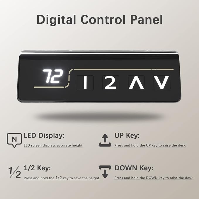 - 【Memory Electric Lift】Compared with the ordinary office desks, this standing desk can easily control lifting heights using buttons, so it suits people of different heights in different scenes. The design of 1/2 memory keys allows it to be quickly adjusted and accurately to your preset comfortable height. The motor system also includes safety lock function, anti-collision function and overheat protection function.