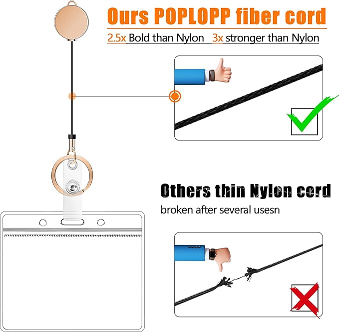 - 【Persistent Badge Reel & Key Ring】The badge reel and key ring is made of zinc alloy. will not fade or rust, nickel-free. The spring in the badge reel is made of stainless steel The retraction force is reliable, strong enough and strong enough to support most of the key's weight without slipping all the way . Built-in ultra-resistant fiber rope, 3x stronger than Nylon cord of generic badge reel so you never have to worry about them falling off