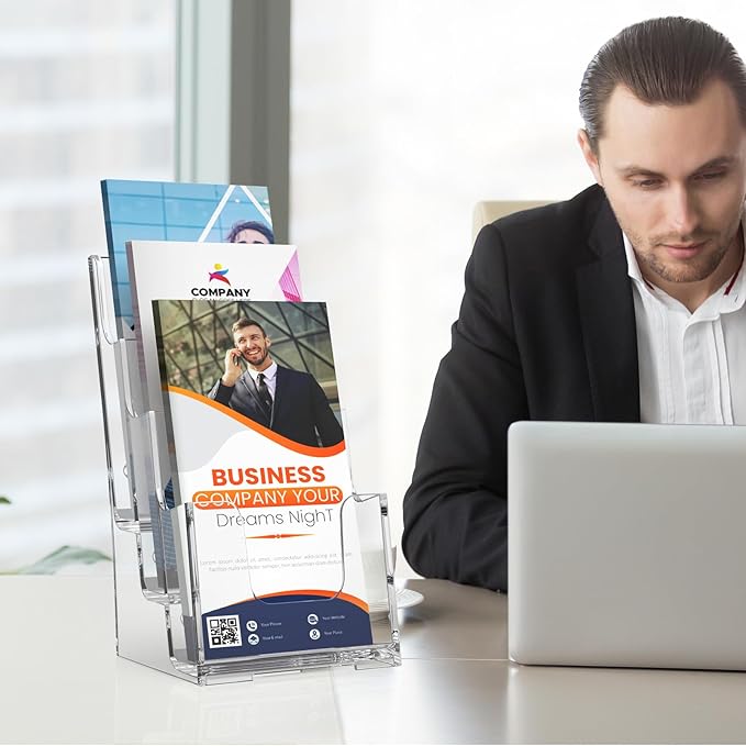 - SLANT BACK DESIGN NON-SLIP SLOT: The flyer holder can stand stably on your desktop with slanted back design. Non-slip slots make sure your brochures look good and never get curled or warped at the bottom. You can put brochures in and out conveniently.