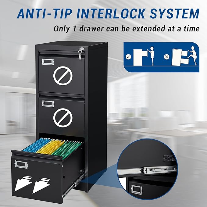 - LOCKABLE 3 DRAWERS FILE CABINET - All the file drawers can be locked by one lock, It is very convenient to control the whole filing cabinet with one key.