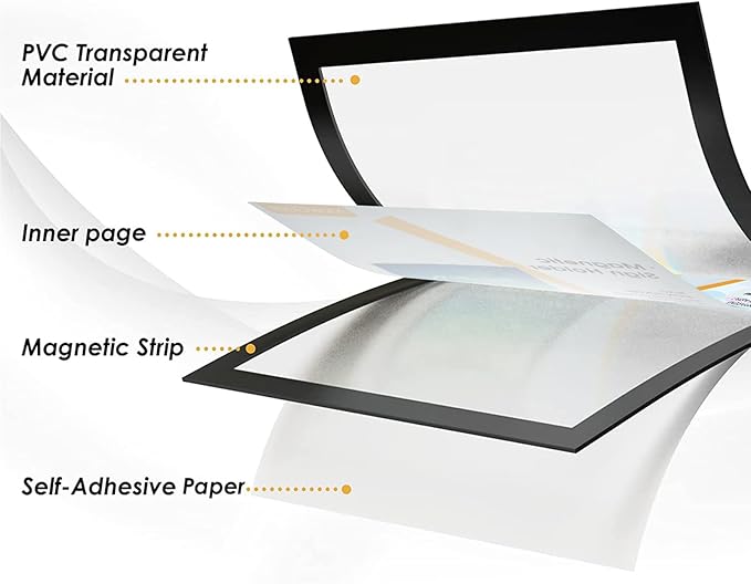 - Transparent Surface: The soft and durable PVC material protects the paper from dust, water, or moisture. These magnetic sign holders can be used on smooth walls, windows, elevators, metal doors, blackboards, and more.