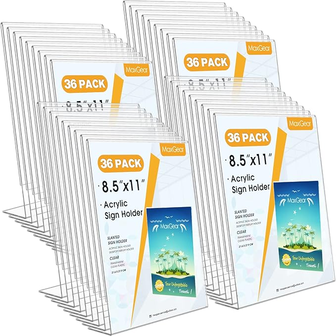 MaxGear Acrylic Sign Holder 8.5 X 11 inches Slant Back Sign Holder Clear Sign Display Holder Plastic Display Stands Table Sign Display Holder for Office, Home, Store, Restaurant - Vertical, 36 Pack