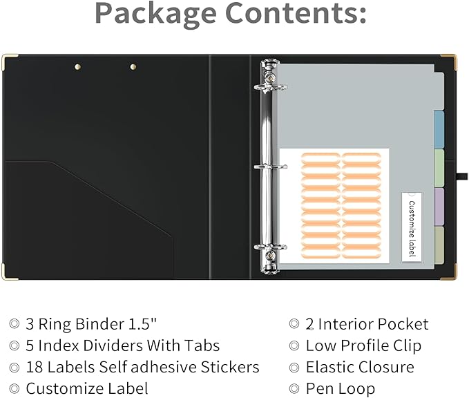 Ospelelf 3 Ring Binder, 1.5 Inch, Cute Letter Size (11" x 8.5") with 5 Tab Dividers, File Folder Labels and Low Profile Clipboards, Black Binder for School and Office Supplies