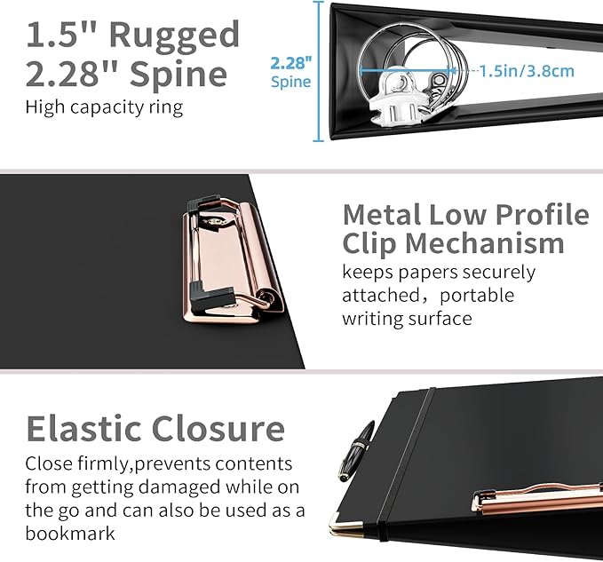 - 【Clipboard & Elastic Closure Design】Letter-size clipboard with durable cardboard base provides a hard, portable writing surface;Low-profile clip can hold up to 100 sheets of 20-pound paper. In addition, the binder's elastic closure not only can close the binder firmly, but also acts as a bookmark.