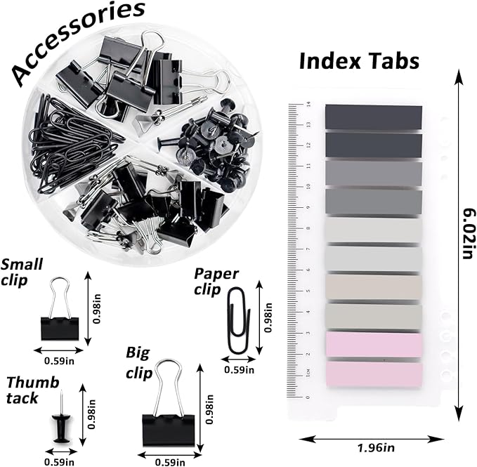 - PACKAGE INCLUDES - This black office supplies contains 1x 6.29inch Stapler , 1x Staple Remover, 1000x Staples, 1x Tape Dispenser, 1x Office Scissor, 25x Push pins 10x Big Clips 20x Small Clips 45x Paper Clips, 10 colors Tabs with ruler. Such a complete black desk accessories combination can meet your daily office and study needs.